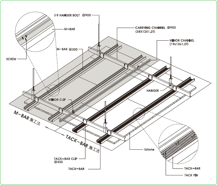 碧山 Eztone は軽量鋼材の支え台の上に直接施工できるロックウール吸音天井材です。 既存の工法とは違ってビス工法やタッカー工法で軽量鋼材の上に直接施工しますので、材料費削減はもちろん工事期間を短縮することができる製品であり、また碧山 Eztone はロックウールを主原料として使用して人体に無害で、高い吸音性能、不燃性能、そして簡便な施工が可能です。