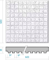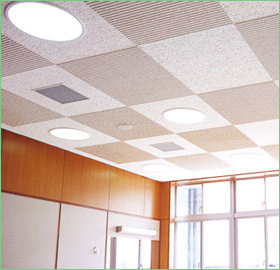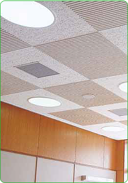 最も堅牢な構造及び高い吸音率 Fissured紋様の標準品と柄加工品の組合を通じる様々なデザイン演出ロックウール吸音天井板の標準品