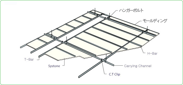 T-BarとH-Barで製品を連結・施工して天井の大規格化を図り、統一感のある雰囲気を演出するSYSTEM
