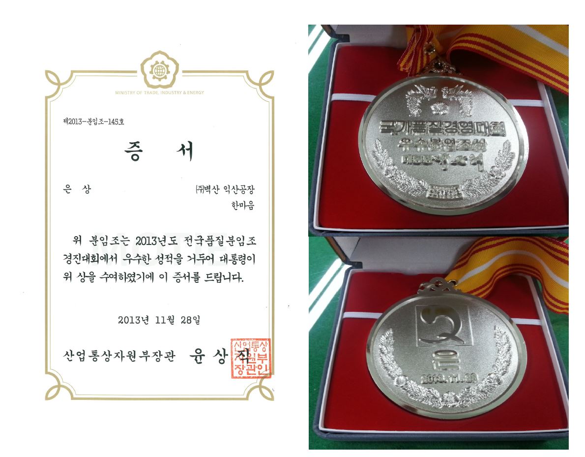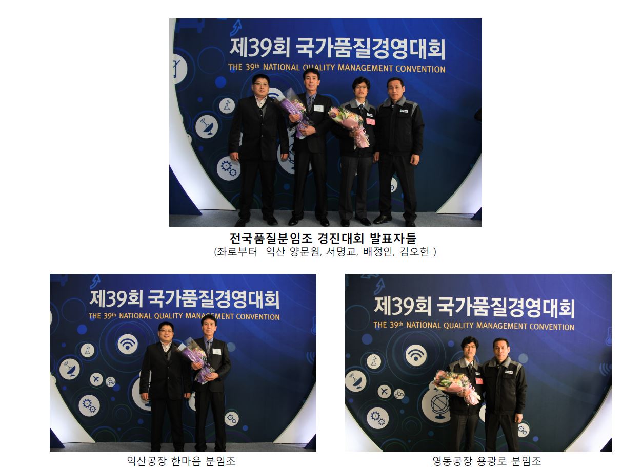 2013년 11월 28일 서울 삼성동 한국전력 한빛홀에서 개최된 제39회 국가품질경영대회에서 익산공장(한마음조) / 영동공장(용광로분임조) 가 대통령상을 수상하였습니다.